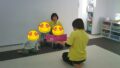 平均台に立つ、フープに入る、という指示を聞いて動きました。小学生は平均台、幼稚園、保育園生はフープ、という