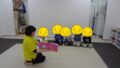 音楽が止まったらマットに集まり、「うつ伏せ」や「仰向け」になりました。ことばの意味を理解したり、みんなで寝転ぶことも
