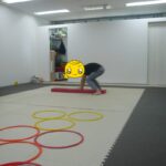 慎重に縄上を歩く、コーンを跨ぐ、平均台に登って降りるなど縄運動を
