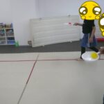 フライパンにボールを乗せて、縄上を歩きました。