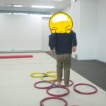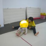 となりのお友だちのフープ内に入れました。手を体の近くに置くと