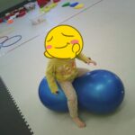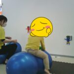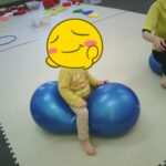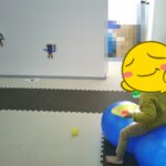 バランスボールに乗って、鬼に向かってボールを投げました。