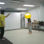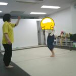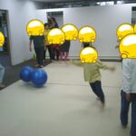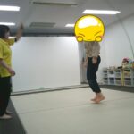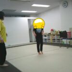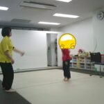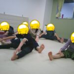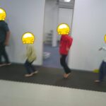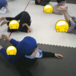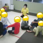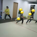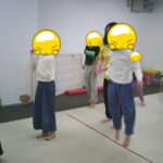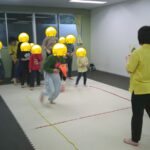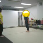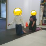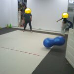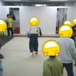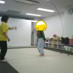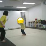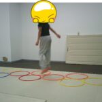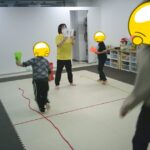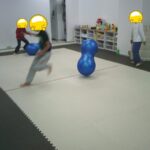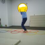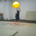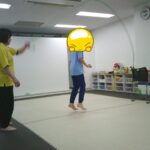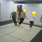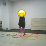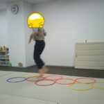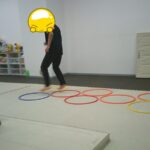 縄上を前、後ろ歩き、カニ歩き、左右ジャンプなどを行いました。
