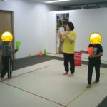 コーンに指定された数のボールを入れて運ぶレースはカードをよく見て迅速に