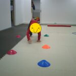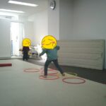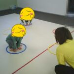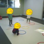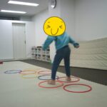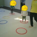 色々な方向に転がってくるフープを色を言いながら、取りました。