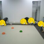 指定された色のフープに入り、職員がいる方に体を向けました。