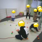 ボールを投げてみんなでイラストの貼ってあるペットボトルを倒しました。
