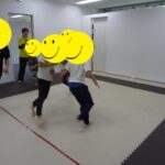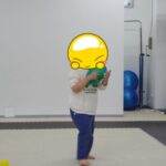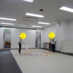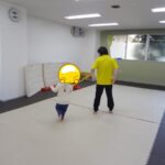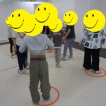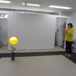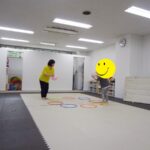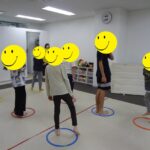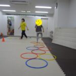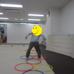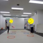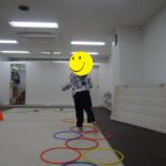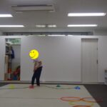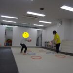 お友だちとも動きを合わせて、フープを移動しながらボールをついていきました。